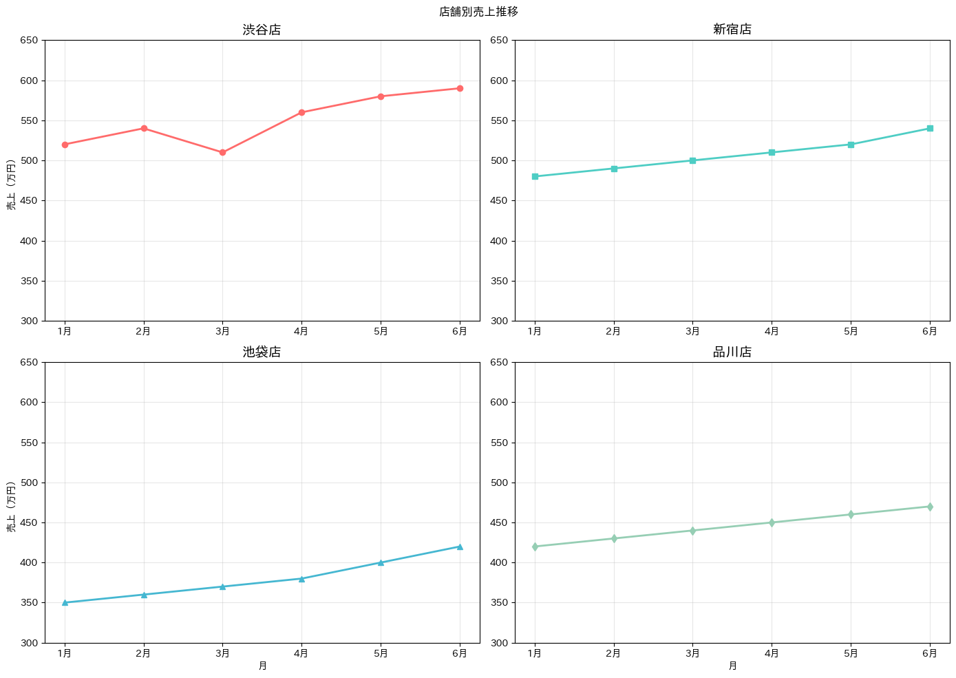 # 2行2列のサブプロットを作成 fig, axes = plt.subplots( 2, # 行数 2, # 列数 figsize=(14, 10) # グラフのサイズ ) # グラフのタイトルを設定 fig.suptitle('店舗別売上推移') # 渋谷店(左上) axes[0, 0].plot( months, # x軸のデータ(月) shibuya, # y軸のデータ(売上) marker='o', # マーカーの形状(丸) color='#FF6B6B', # 線の色(赤系) linewidth=2 # 線の太さ ) axes[0, 0].set_title('渋谷店', fontsize=14) axes[0, 0].set_ylabel('売上(万円)') axes[0, 0].grid(True, alpha=0.3) axes[0, 0].set_ylim(300, 650) # 新宿店(右上) axes[0, 1].plot( months, # x軸のデータ(月) shinjuku, # y軸のデータ(売上) marker='s', # マーカーの形状(四角) color='#4ECDC4', # 線の色(水色) linewidth=2 # 線の太さ ) axes[0, 1].set_title('新宿店', fontsize=14) axes[0, 1].grid(True, alpha=0.3) axes[0, 1].set_ylim(300, 650) # 池袋店(左下) axes[1, 0].plot( months, # x軸のデータ(月) ikebukuro, # y軸のデータ(売上) marker='^', # マーカーの形状(三角) color='#45B7D1', # 線の色(青系) linewidth=2 # 線の太さ ) axes[1, 0].set_title('池袋店', fontsize=14) axes[1, 0].set_xlabel('月') axes[1, 0].set_ylabel('売上(万円)') axes[1, 0].grid(True, alpha=0.3) axes[1, 0].set_ylim(300, 650) # 品川店(右下) axes[1, 1].plot( months, # x軸のデータ(月) shinagawa, # y軸のデータ(売上) marker='d', # マーカーの形状(菱形) color='#96CEB4', # 線の色(緑系) linewidth=2 # 線の太さ ) axes[1, 1].set_title('品川店', fontsize=14) axes[1, 1].set_xlabel('月') axes[1, 1].grid(True, alpha=0.3) axes[1, 1].set_ylim(300, 650) # レイアウトを自動調整 plt.tight_layout() # グラフを表示 plt.show()