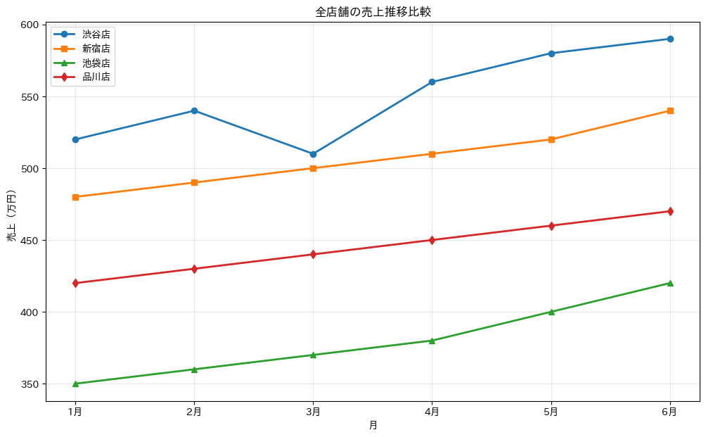 # グラフのサイズを指定 plt.figure(figsize=(12, 7)) # 各店舗の折れ線グラフを描画 plt.plot( months, # x軸のデータ(月) shibuya, # y軸のデータ(売上) marker='o', # マーカーの形状(丸) linewidth=2, # 線の太さ label='渋谷店' # 凡例のラベル ) plt.plot( months, # x軸のデータ(月) shinjuku, # y軸のデータ(売上) marker='s', # マーカーの形状(四角) linewidth=2, # 線の太さ label='新宿店' # 凡例のラベル ) plt.plot( months, # x軸のデータ(月) ikebukuro, # y軸のデータ(売上) marker='^', # マーカーの形状(三角) linewidth=2, # 線の太さ label='池袋店' # 凡例のラベル ) plt.plot( months, # x軸のデータ(月) shinagawa, # y軸のデータ(売上) marker='d', # マーカーの形状(菱形) linewidth=2, # 線の太さ label='品川店' # 凡例のラベル ) # タイトルと軸ラベルを設定 plt.title('全店舗の売上推移比較') plt.xlabel('月') plt.ylabel('売上(万円)') # 凡例を表示 plt.legend(loc='upper left') # 凡例の位置を左上に設定 # グリッドを追加 plt.grid(True, alpha=0.3) # グラフを表示 plt.show()