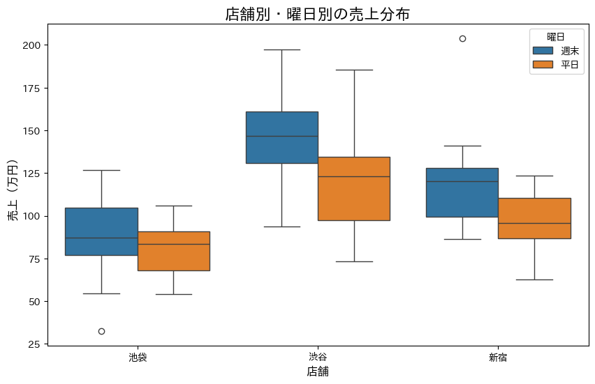 # グラフのサイズを指定 plt.figure(figsize=(10, 6)) # 箱ひげ図を作成 sns.boxplot( data=data, # データフレーム x='店舗', # x軸のデータ(店舗) y='売上', # y軸のデータ(売上) hue='曜日' # 曜日によるグループ分け ) # グラフのタイトルと軸ラベルを設定 plt.title('店舗別・曜日別の売上分布') plt.ylabel('売上(万円)') plt.xlabel('店舗') # グラフを表示 plt.show()