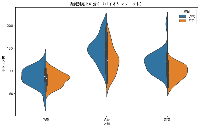 # グラフのサイズを指定 plt.figure(figsize=(10, 6)) # バイオリンプロットを作成 sns.violinplot( data=data, # データフレーム x='店舗', # x軸のデータ(店舗) y='売上', # y軸のデータ(売上) hue='曜日', # 曜日によるグループ分け split=True # 分割して表示 ) # グラフのタイトルと軸ラベルを設定 plt.title('店舗別売上の分布(バイオリンプロット)') plt.ylabel('売上(万円)') plt.xlabel('店舗') # グラフを表示 plt.show()