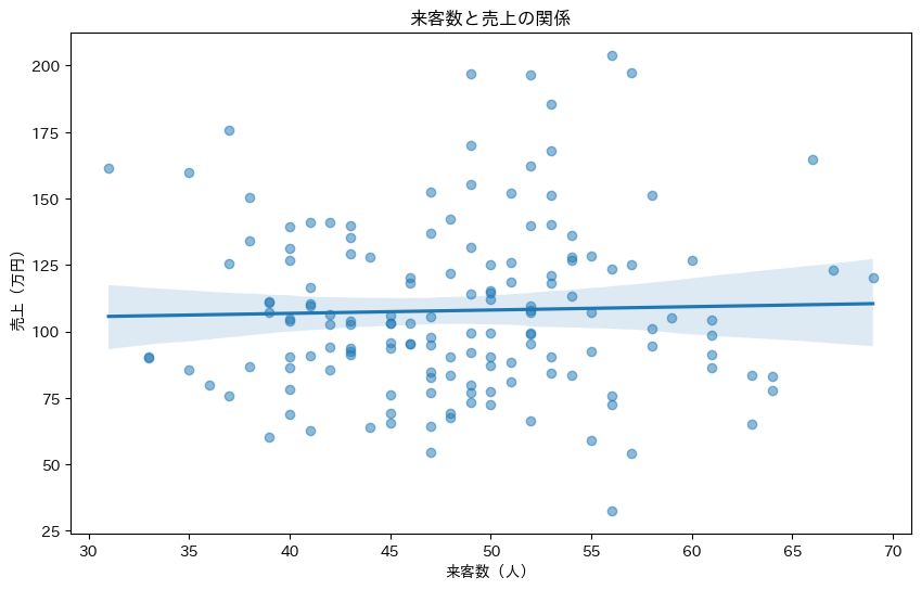# グラフのサイズを指定 plt.figure(figsize=(10, 6)) # 散布図と回帰線を作成 sns.regplot( data=data, # データフレーム x='来客数', # x軸のデータ(来客数) y='売上', # y軸のデータ(売上) scatter_kws={'alpha': 0.5} # 散布図の透明度 ) # グラフのタイトルと軸ラベルを設定 plt.title('来客数と売上の関係') plt.xlabel('来客数(人)') plt.ylabel('売上(万円)') # グラフを表示 plt.show()