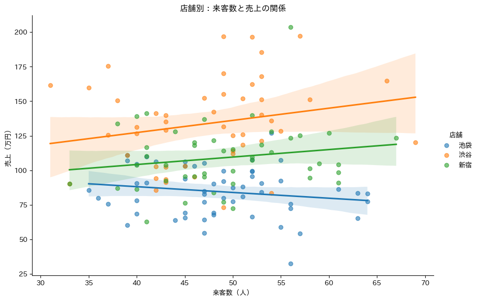 # 散布図と回帰線を作成 g = sns.lmplot( data=data, # データフレーム x='来客数', # x軸のデータ(来客数) y='売上', # y軸のデータ(売上) hue='店舗', # 店舗によるグループ分け height=6, # グラフの高さ aspect=1.5, # グラフの幅の倍率 scatter_kws={'alpha': 0.6} # 散布図の透明度 ) # 軸ラベルを設定 g.set_axis_labels( "来客数(人)", # x軸のラベル "売上(万円)" # y軸のラベル ) # グラフのタイトルを設定 plt.title('店舗別:来客数と売上の関係') # グラフを表示 plt.show()