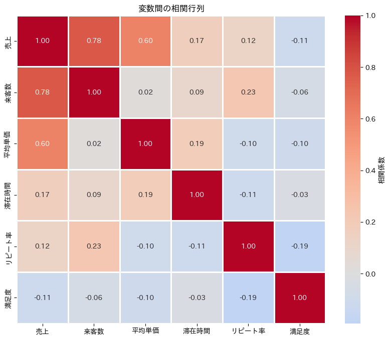 # より多くの変数を持つデータを作成 np.random.seed(123) n = 100 analysis_data = pd.DataFrame({ '売上': np.random.normal(100, 20, n), '来客数': np.random.normal(50, 10, n), '平均単価': np.random.normal(2000, 300, n), '滞在時間': np.random.normal(30, 8, n), 'リピート率': np.random.uniform(0.2, 0.8, n), '満足度': np.random.uniform(3, 5, n) }) # 変数間にあえて相関を作る analysis_data['売上'] = ( analysis_data['来客数'] * analysis_data['平均単価'] / 500 + np.random.normal(0, 10, n) ) analysis_data['満足度'] = ( analysis_data['満足度'] + analysis_data['滞在時間'] / 100 ) print("サンプルデータの最初の10行:") print(analysis_data.head(10)) print(f"\nデータ総数: {len(analysis_data)}行")