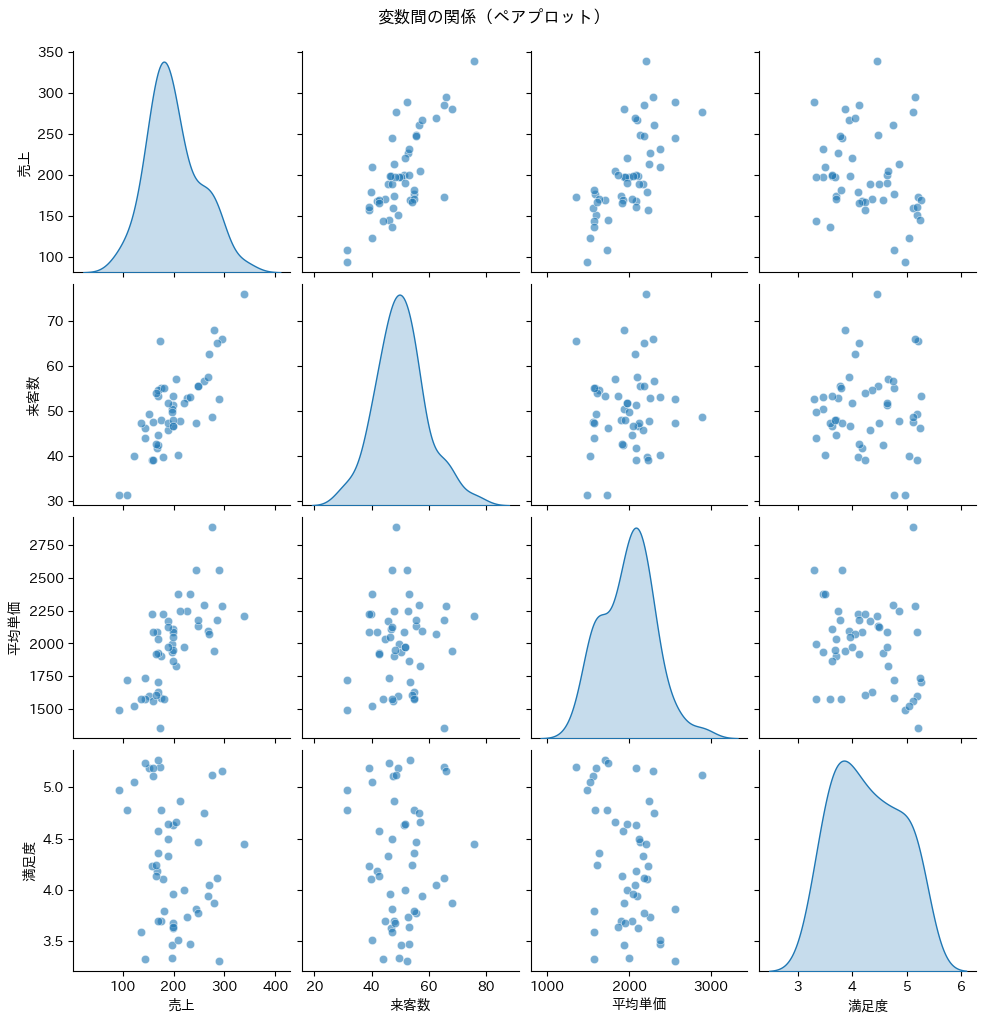 # 分析用のデータを準備(少し小さめのデータセット) pair_data = analysis_data[[ '売上', '来客数', '平均単価', '満足度' ]].sample(50) # ペアプロットを作成し、変数gに格納 g = sns.pairplot( pair_data, # データフレーム diag_kind='kde', # 対角線上のプロットをカーネル密度推定(KDE)で表示 plot_kws={'alpha': 0.6}, # 散布図の透明度(アルファ値)を0.6に設定 height=2.5 # 各サブプロットの高さを2.5インチに設定 ) # タイトルを設定 g.fig.suptitle( '変数間の関係(ペアプロット)', # タイトルのテキスト y=1.02 # タイトルの位置(y軸方向) ) # グラフを表示 plt.show()