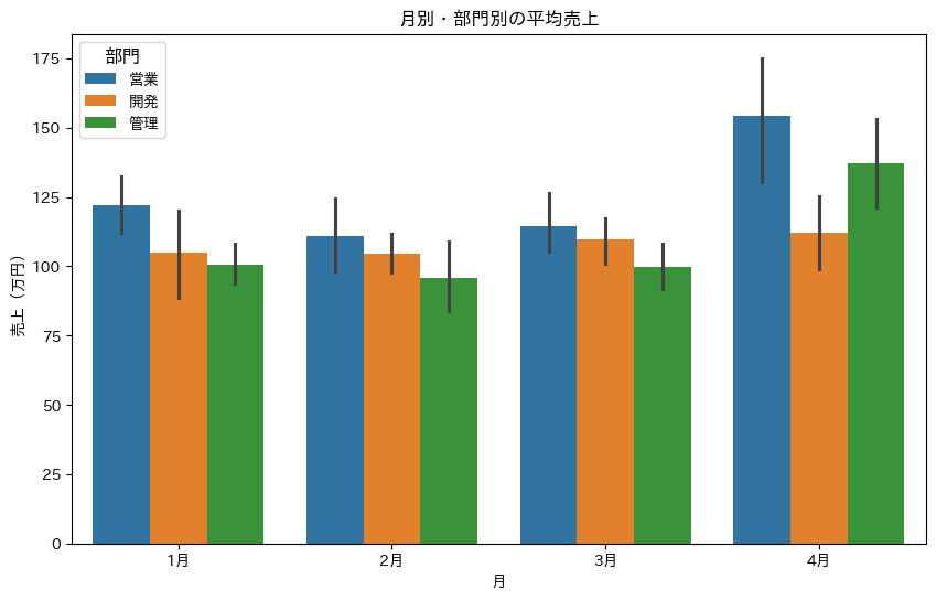 # グラフのサイズを指定 plt.figure(figsize=(10, 6)) # 棒グラフを作成 sns.barplot( data=cat_data, # データフレーム x='月', # x軸のデータ(月) y='売上', # y軸のデータ(売上) hue='部門', # 部門によるグループ分け errorbar=('ci', 95) # 95%信頼区間を表示 ) # グラフのタイトルと軸ラベルを設定 plt.title('月別・部門別の平均売上') plt.ylabel('売上(万円)') plt.xlabel('月') # 凡例を表示 plt.legend( title='部門', # 凡例のタイトル title_fontsize=12, # タイトルのフォントサイズ loc='upper left' # 凡例の位置(左上) ) # グラフを表示 plt.show()