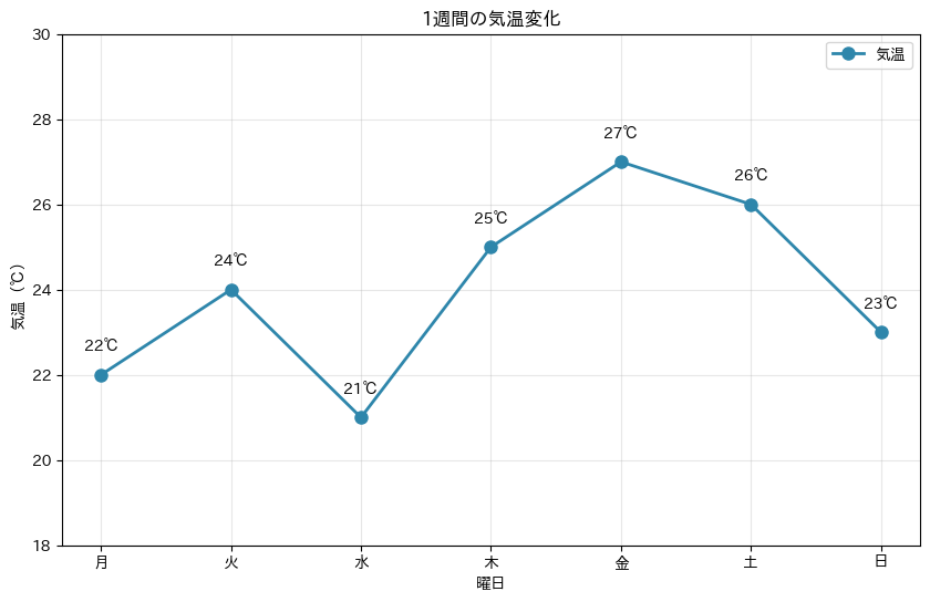 # グラフのサイズを指定 plt.figure(figsize=(10, 6)) # 折れ線グラフを描画(マーカーを追加) plt.plot( days, # x軸のデータ(曜日) temperatures, # y軸のデータ(気温) marker='o', # マーカーの形状(丸) linestyle='-', # 線の種類(実線) color='#2E86AB',# 線の色(青系) linewidth=2, # 線の太さ markersize=8, # マーカーのサイズ label='気温' # 凡例のラベル ) # グリッドを追加 plt.grid(True, alpha=0.3) # 各データポイントに値を表示 for i, temp in enumerate(temperatures): plt.text( i, # x座標 temp + 0.5, # y座標(気温の上に表示) f'{temp}℃', # 表示するテキスト ha='center', # 水平方向の配置(中央) va='bottom', # 垂直方向の配置(下部) fontsize=10 # フォントサイズ ) # タイトルと軸ラベルを設定 plt.title('1週間の気温変化') plt.xlabel('曜日') plt.ylabel('気温(℃)') # y軸の範囲を設定 plt.ylim(18, 30) # 凡例を表示 plt.legend() # グラフを表示 plt.show()