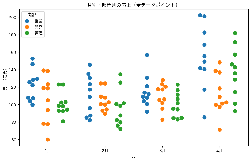 # グラフのサイズを指定 plt.figure(figsize=(10, 6)) # スウォームプロットを作成 sns.swarmplot( data=cat_data, # データフレーム x='月', # x軸のデータ(月) y='売上', # y軸のデータ(売上) hue='部門', # 部門によるグループ分け dodge=True, # グループを分離して表示 size=10 # マーカーのサイズ ) # グラフのタイトルと軸ラベルを設定 plt.title('月別・部門別の売上(全データポイント)') plt.ylabel('売上(万円)') plt.xlabel('月') # 凡例を表示 plt.legend( title='部門', # 凡例のタイトル title_fontsize=12, # タイトルのフォントサイズ loc='upper left' # 凡例の位置(左上) ) # グラフを表示 plt.show()