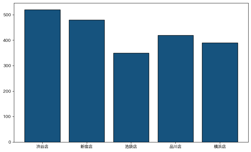 # 棒グラフ:店舗別売上の比較 stores = ['渋谷店', '新宿店', '池袋店', '品川店', '横浜店'] sales = [520, 480, 350, 420, 390] # グラフのサイズを指定 plt.figure(figsize=(10, 6)) # 棒グラフを作成 bars = plt.bar( stores, # x軸のデータ(店舗名) sales, # y軸のデータ(売上) color='#16537e', # 棒の色(濃い青) edgecolor='black', # 枠線の色(黒) linewidth=1 # 枠線の太さ )