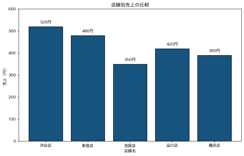 # グラフのサイズを指定 plt.figure(figsize=(10, 6)) # 棒グラフを作成 bars = plt.bar( stores, # x軸のデータ(店舗名) sales, # y軸のデータ(売上) color='#16537e', # 棒の色(濃い青) edgecolor='black', # 枠線の色(黒) linewidth=1 # 枠線の太さ ) # 各データポイントに値を表示 for bar, sale in zip(bars, sales): yval = bar.get_height() plt.text( bar.get_x() + bar.get_width() / 2, # x座標(棒の中央) yval + 10, # y座標(棒の上に表示) f'{sale}円', # 表示するテキスト ha='center', # 水平方向の配置(中央) va='bottom', # 垂直方向の配置(下部) fontsize=10 # フォントサイズ ) # タイトルと軸ラベルを設定 plt.title('店舗別売上の比較') plt.xlabel('店舗名') plt.ylabel('売上(円)') # y軸の範囲を設定 plt.ylim(0, 600) # グラフを表示 plt.show()