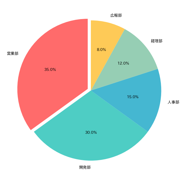 # 円グラフ:部門別予算配分 departments = ['営業部', '開発部', '人事部', '経理部', '広報部'] budgets = [35, 30, 15, 12, 8] colors = ['#FF6B6B', '#4ECDC4', '#45B7D1', '#96CEB4', '#FECA57'] # グラフのサイズを指定 plt.figure(figsize=(10, 8)) # 円グラフを作成 plt.pie( budgets, # データ(予算) labels=departments, # ラベル(部門名) colors=colors, # 色 autopct='%1.1f%%', # パーセンテージを表示 startangle=90, # 開始角度を指定(90度から開始) explode=[ 0.05, # 営業部を突出させる 0, # 開発部はそのまま 0, # 人事部はそのまま 0, # 経理部はそのまま 0 # 広報部はそのまま ] ) # グラフを表示 plt.show()
