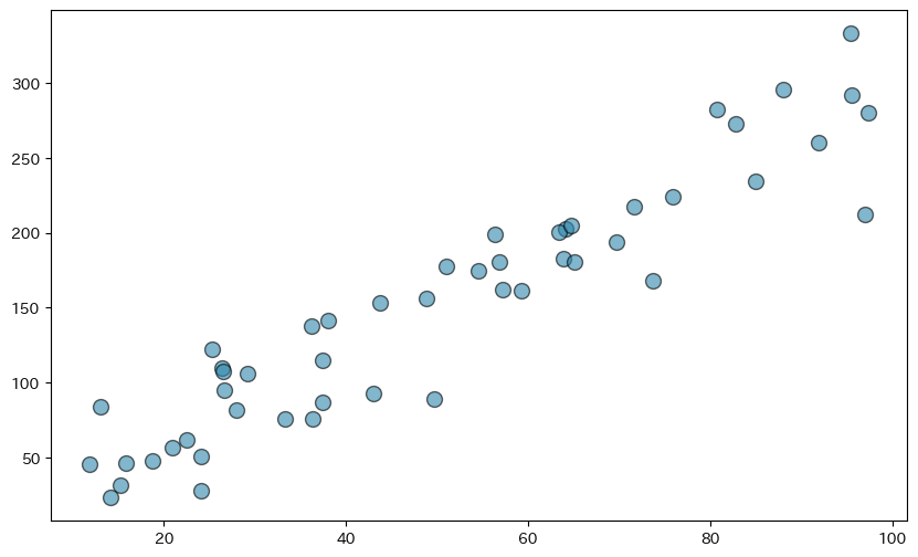 # 散布図:広告費と売上の関係 np.random.seed(42) ad_spending = np.random.uniform(10, 100, 50) # 広告費(万円) sales = ad_spending * 3 + np.random.normal(0, 30, 50) # 売上(万円) # グラフのサイズを指定 plt.figure(figsize=(10, 6)) # 散布図を作成 plt.scatter( ad_spending, # x軸のデータ(広告費) sales, # y軸のデータ(売上) alpha=0.6, # 透明度 s=100, # マーカーのサイズ c='#2E86AB', # マーカーの色 edgecolors='black' # 枠線の色 ) # グラフを表示 plt.show()
