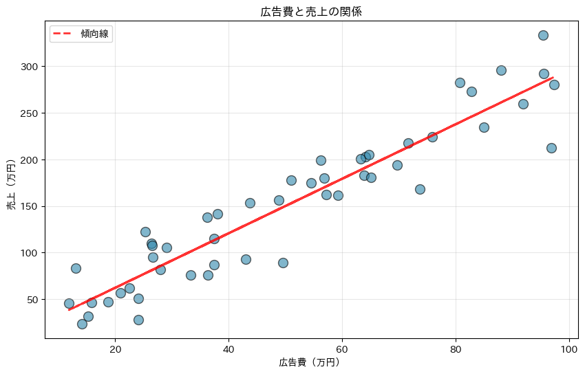 # グラフのサイズを指定 plt.figure(figsize=(10, 6)) # 散布図を作成 plt.scatter( ad_spending, # x軸のデータ(広告費) sales, # y軸のデータ(売上) alpha=0.6, # 透明度 s=100, # マーカーのサイズ c='#2E86AB', # マーカーの色 edgecolors='black' # 枠線の色 ) # np.polyfitで傾向線の傾きと切片を計算 z = np.polyfit( ad_spending, # x軸のデータ(広告費) sales, # y軸のデータ(売上) 1 # 1次の多項式でフィット ) # np.poly1dで多項式を作成 p = np.poly1d(z) # 傾向線を描画 plt.plot( ad_spending, # x軸のデータ(広告費) p(ad_spending), # y軸のデータ(傾向線) "r-", # 線の色と種類(赤色の実線) alpha=0.8, # 透明度 linewidth=2, # 線の太さ label='傾向線' # 凡例のラベル ) # タイトルと軸ラベルを設定 plt.title('広告費と売上の関係') plt.xlabel('広告費(万円)') plt.ylabel('売上(万円)') # グリッドを追加 plt.grid(True, alpha=0.3) # 凡例を表示 plt.legend() # グラフを表示 plt.show()