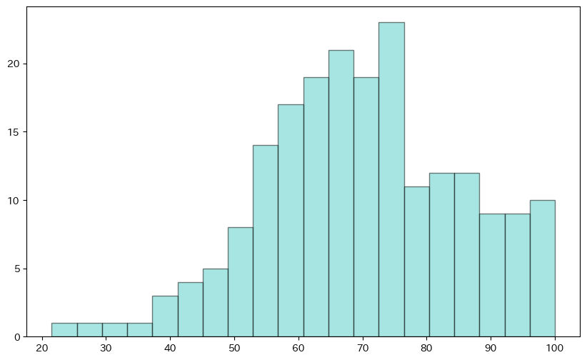 # ヒストグラム:テストの点数分布 np.random.seed(123) scores = np.random.normal(70, 15, 200) # 平均70点、標準偏差15の正規分布 scores = np.clip(scores, 0, 100) # 0-100点の範囲に制限 # グラフのサイズを指定 plt.figure(figsize=(10, 6)) # ヒストグラムを作成 n, bins, patches = plt.hist( scores, # データ(点数) bins=20, # ビンの数(20個) color='#4ECDC4', # 棒の色(水色) edgecolor='black', # 枠線の色(黒) alpha=0.5 # 透明度 ) # グラフを表示 plt.show()