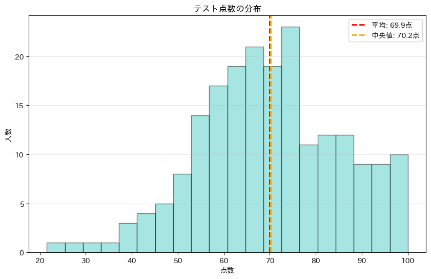 # グラフのサイズを指定 plt.figure(figsize=(10, 6)) # ヒストグラムを作成 n, bins, patches = plt.hist( scores, # データ(点数) bins=20, # ビンの数(20個) color='#4ECDC4', # 棒の色(水色) edgecolor='black', # 枠線の色(黒) alpha=0.5 # 透明度 ) # np.meanで平均値を計算 mean_score = np.mean(scores) # 平均値を表示する垂直線を追加 plt.axvline( mean_score, # 平均値の位置 color='red', # 線の色(赤) linestyle='--', # 線の種類(破線) linewidth=2, # 線の太さ label=f'平均: {mean_score:.1f}点' # 凡例のラベル ) # np.medianで中央値を計算 median_score = np.median(scores) # 中央値を表示する垂直線を追加 plt.axvline( median_score, # 中央値の位置 color='orange', # 線の色(オレンジ) linestyle='--', # 線の種類(破線) linewidth=2, # 線の太さ label=f'中央値: {median_score:.1f}点' # 凡例のラベル ) # タイトルと軸ラベルを設定 plt.title('テスト点数の分布') plt.xlabel('点数') plt.ylabel('人数') # 凡例を表示 plt.legend() # y軸のグリッドを追加 plt.grid(True, axis='y', alpha=0.3) # グラフを表示 plt.show()