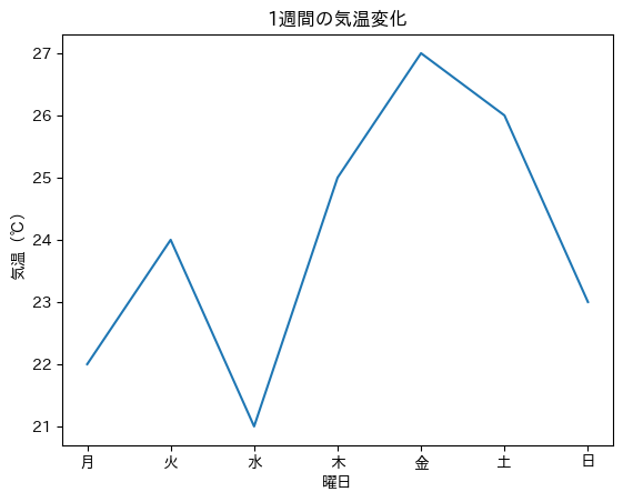 # データの準備 days = ['月', '火', '水', '木', '金', '土', '日'] temperatures = [22, 24, 21, 25, 27, 26, 23] # グラフを作成 plt.plot(days, temperatures) # 折れ線グラフを描画 plt.title('1週間の気温変化') # タイトルを設定 plt.xlabel('曜日') # x軸のラベルを設定 plt.ylabel('気温(℃)') # y軸のラベルを設定 plt.show() # グラフを表示