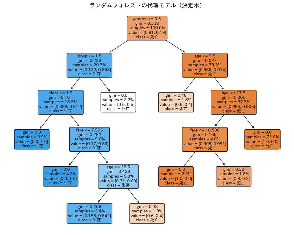Surrogate Modelにより、複雑なブラックボックスモデルの判断ロジック全体を、人間が読める決定木として近似する方法を紹介しました。「女性と子供を優先、社会階層も考慮」という判断ルールが、明示的なルールとして確認できました。