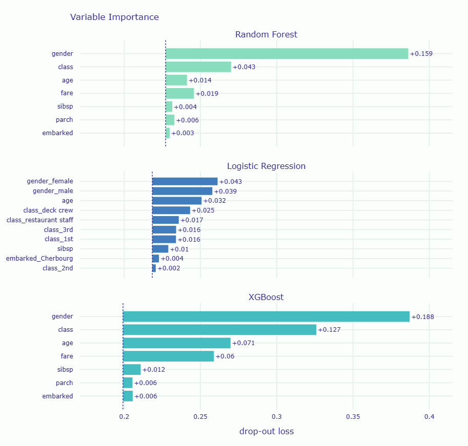 # ランダムフォレストの変数重要度 vi_rf = explainer_rf.model_parts() # ロジスティック回帰の変数重要度 vi_lr = explainer_lr.model_parts() # XGBoostの変数重要度 vi_xgb = explainer_xgb.model_parts() # グラフで比較 vi_rf.plot([vi_lr, vi_xgb], show=True)