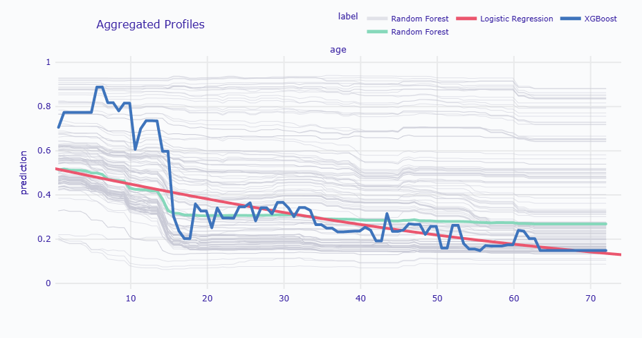 Calculating ceteris paribus: 100%|██████████| 1/1 [00:00<00:00, 9.31it/s] Calculating ceteris paribus: 100%|██████████| 1/1 [00:00<00:00, 195.43it/s] Calculating ceteris paribus: 100%|██████████| 1/1 [00:00<00:00, 50.00it/s] 20歳と60歳での予測値比較: 20歳: ランダムフォレスト: 0.306 ロジスティック回帰: 0.381 XGBoost: 0.328 60歳: ランダムフォレスト: 0.275 ロジスティック回帰: 0.177 XGBoost: 0.175
