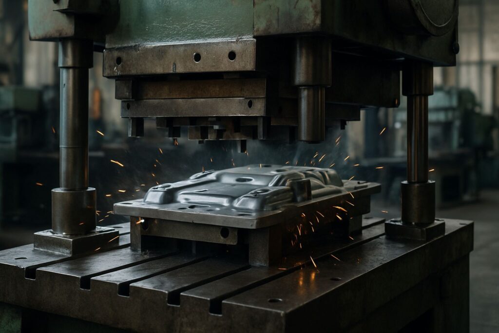 プレス加工の現場です。巨大な金型が、轟音とともに金属板を押し潰し、一瞬で複雑な形状の部品を作り出します。