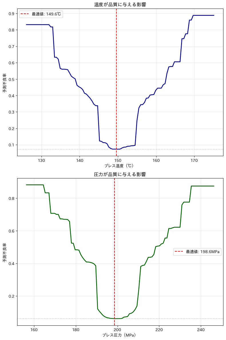 print(f"\n最適化後の予測不良率: {optimal_defect_prob:.2%}")