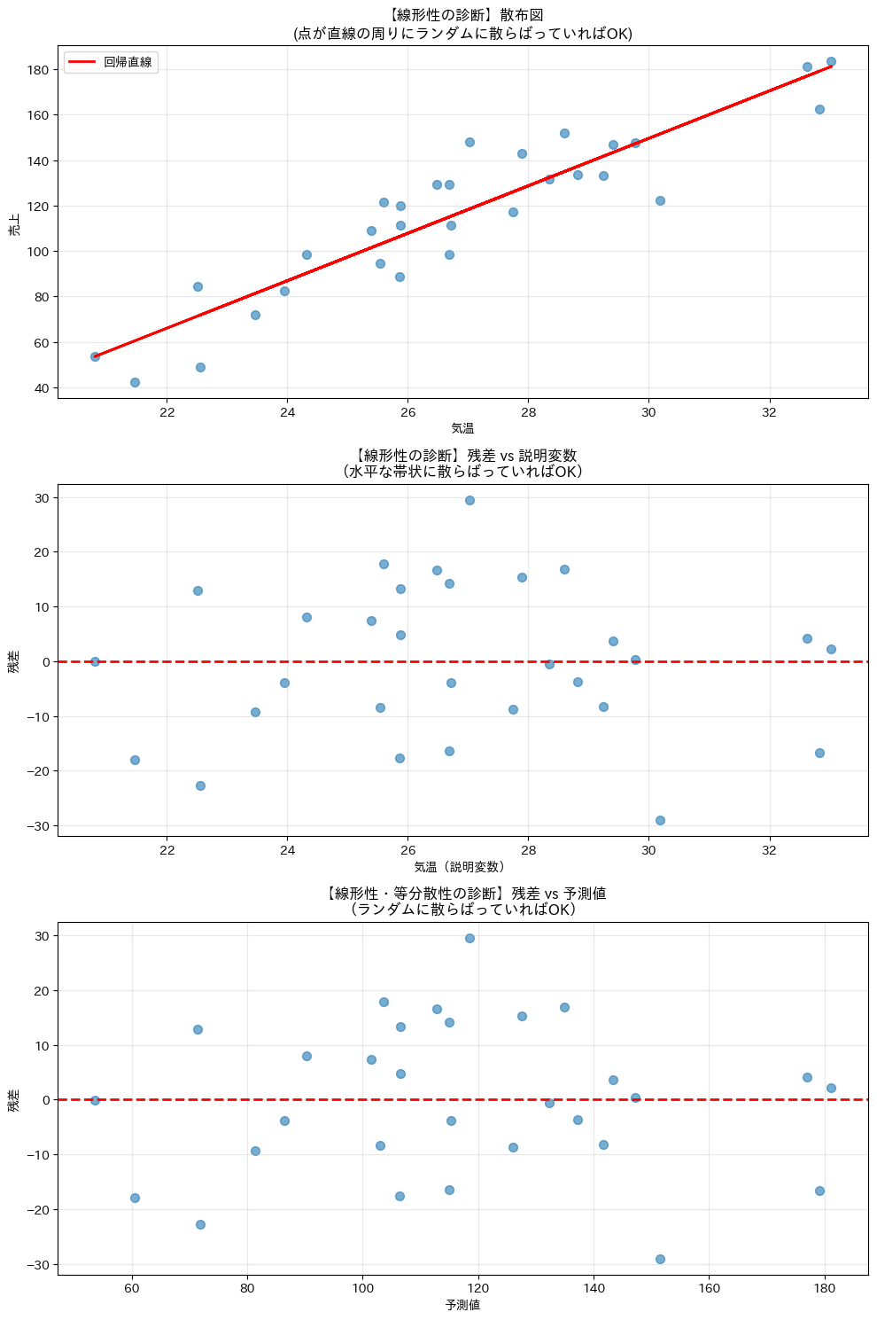 残差の分布が大きく歪んでいる場合、小標本では検定結果の信頼性が下がることがあります。ただし、データ数が十分に多い場合は、多少の非正規性は大きな問題にならないことも多いです。