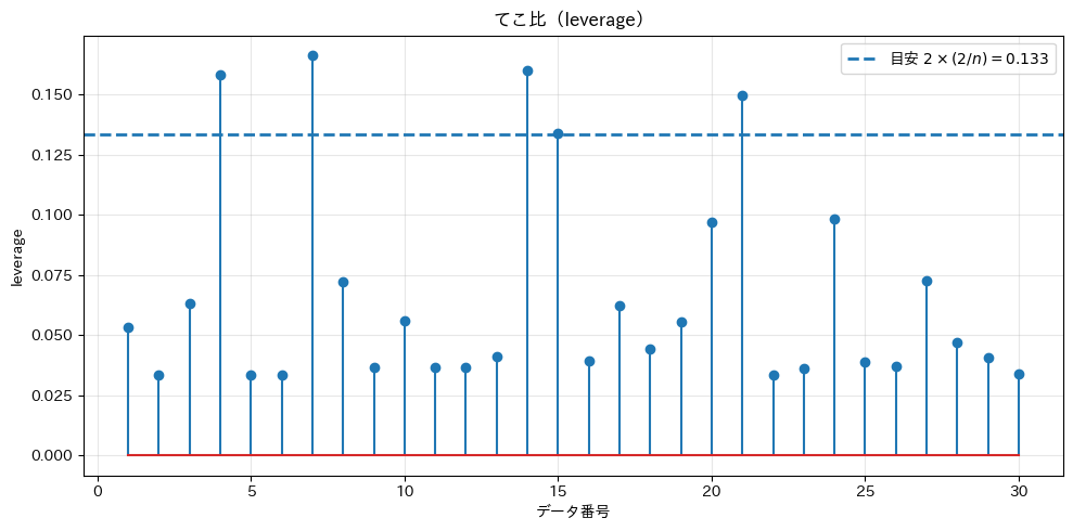 print(f"- データ {i+1}: てこ比 = {leverage[i]:.3f}")