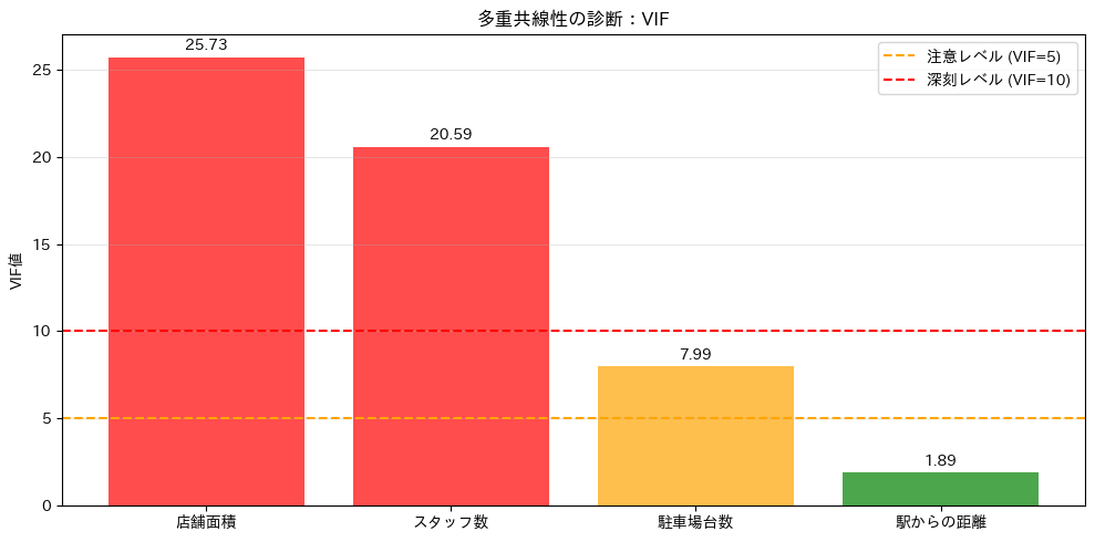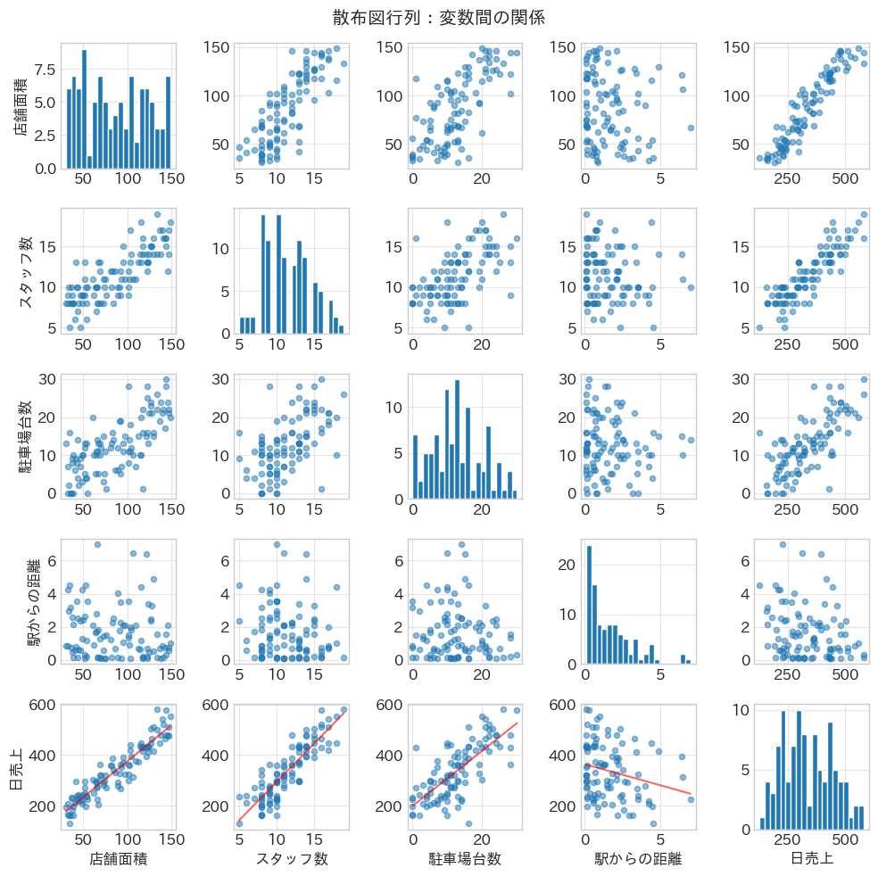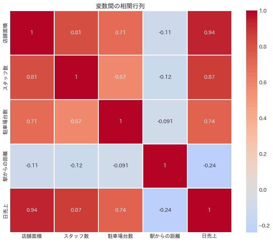 ============================================================ 相関の高い変数ペア(|r| > 0.5) ============================================================ 店舗面積 ↔ スタッフ数 r = 0.806 店舗面積 ↔ 駐車場台数 r = 0.708 スタッフ数 ↔ 駐車場台数 r = 0.574