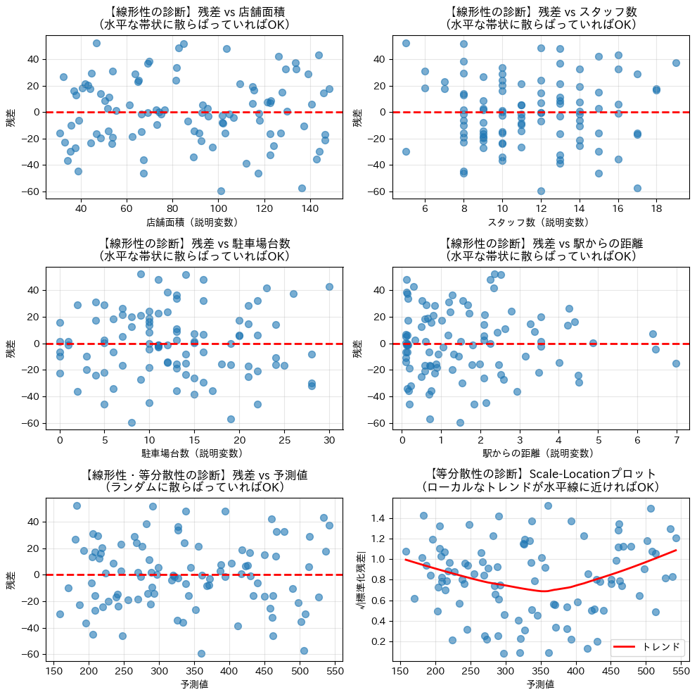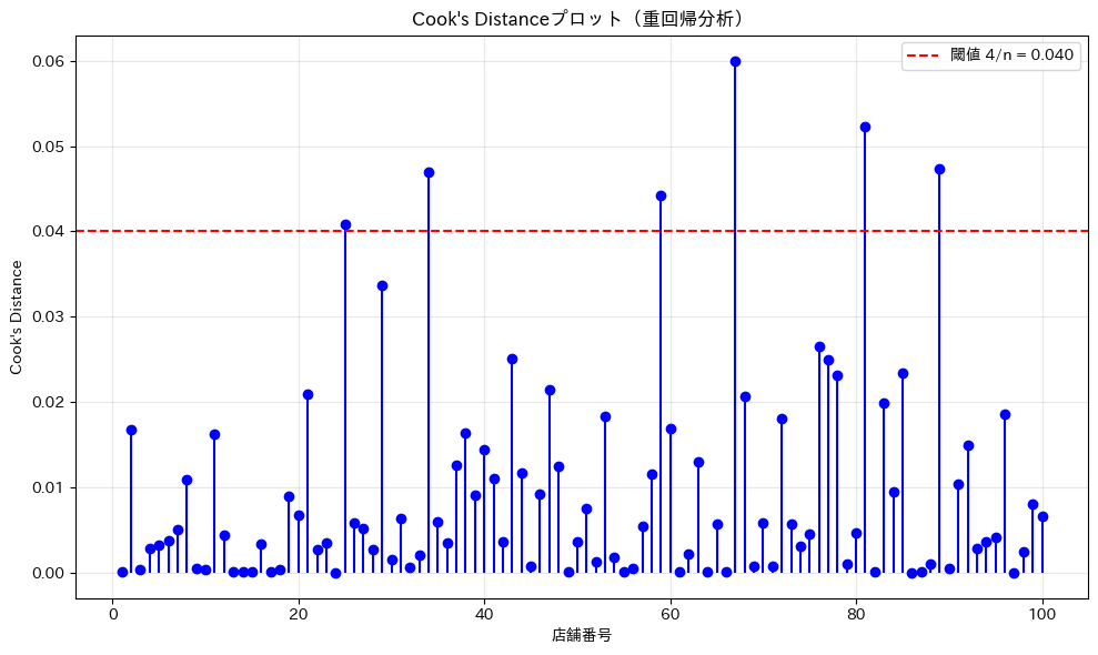 Cook’s Distanceが閾値を超える点は、モデルに大きな影響を与えている可能性があります。これらの店舗は特殊な状況にある可能性があり、個別に調査する価値があります。