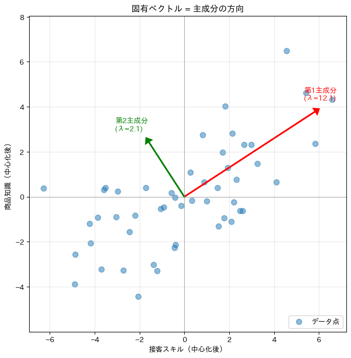 - 固有ベクトル = 主成分の方向(データが広がっている方向)