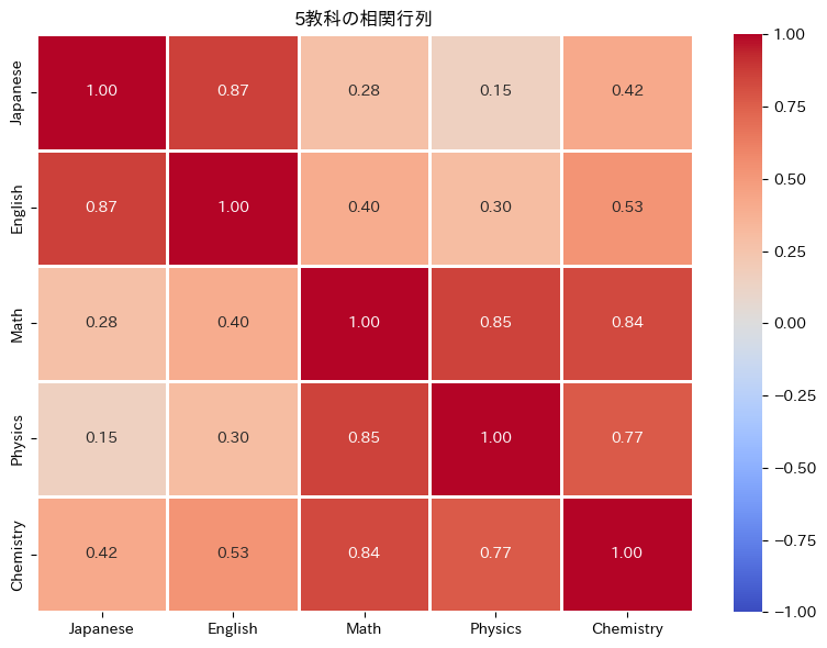 まず、「言語能力」と「数理能力」という2つの潜在因子から5教科の成績が生成される、というシナリオでデータを作成します。