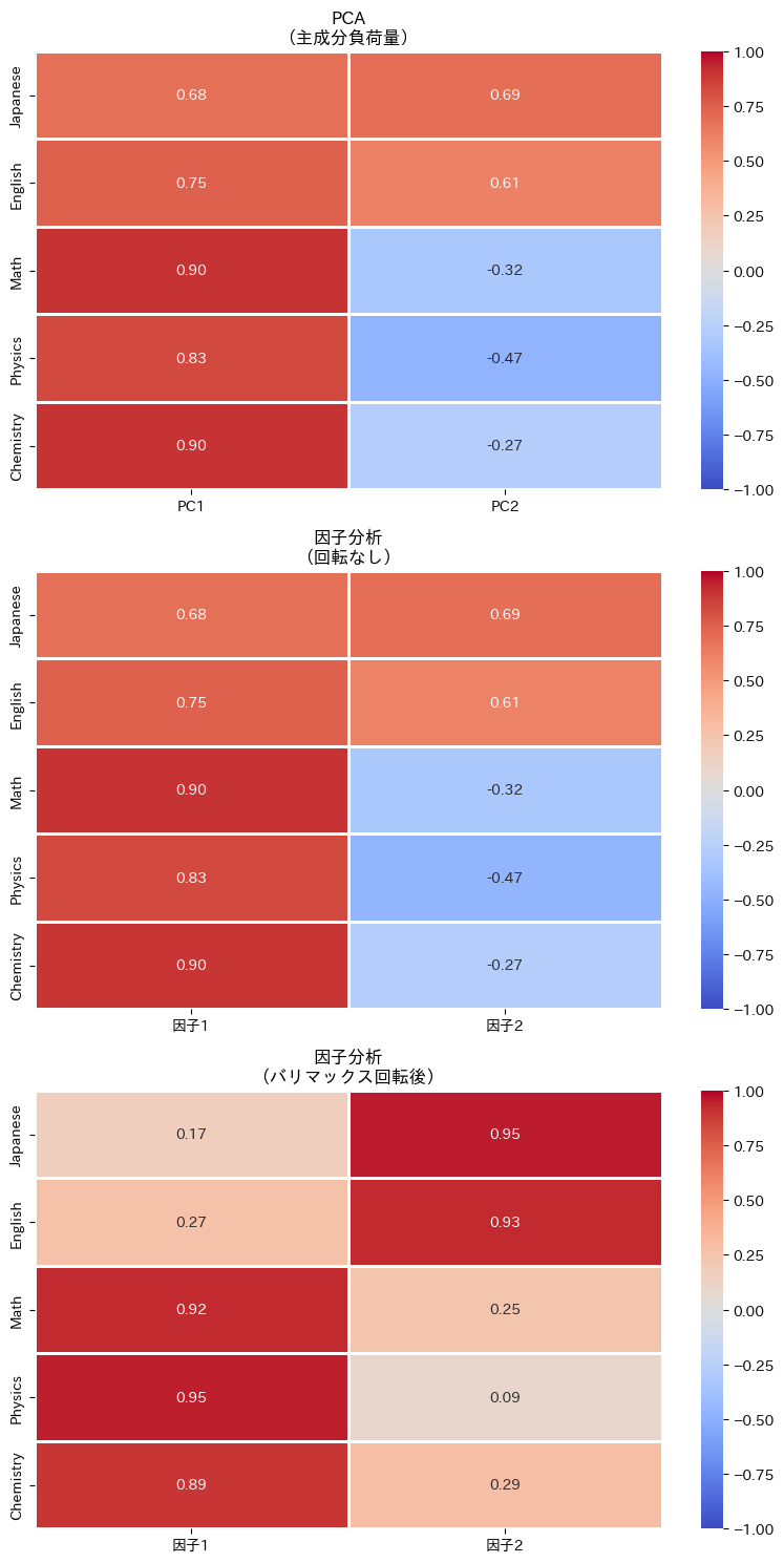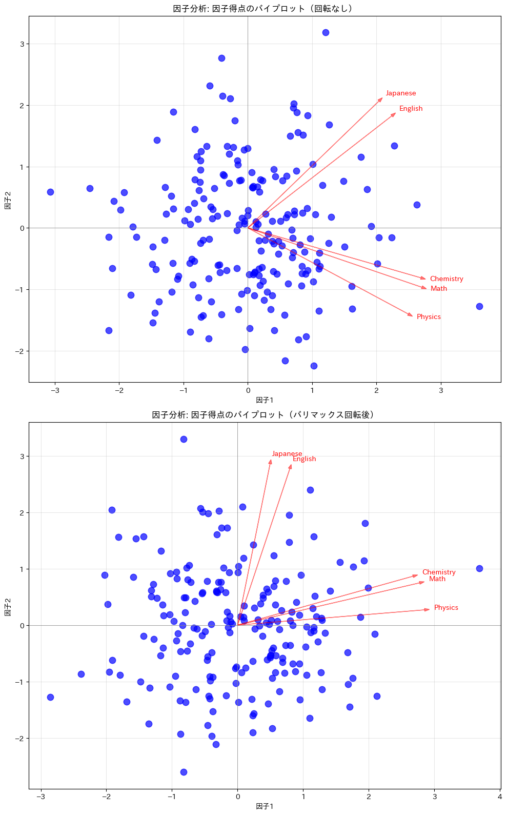 今回の結果では、因子1は数学・物理・化学に高い負荷を持ち、因子2は国語・英語に高い負荷を持っていました。これにより「因子1=数理能力」「因子2=言語能力」と命名できます。