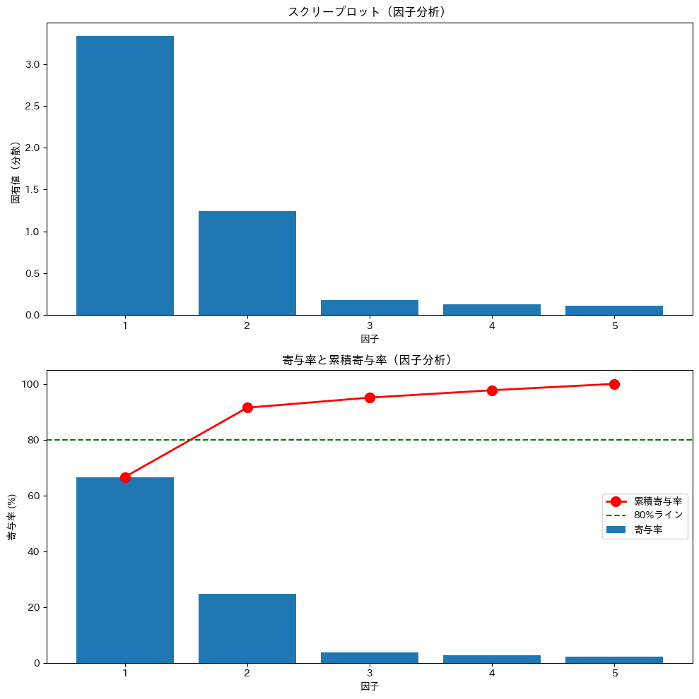 肘法(エルボー法)では、スクリープロットで固有値が急に小さくなる「肘」の位置で打ち切ります。今回のグラフでは、第2因子と第3因子の間で傾きが急に緩やかになっているため、2因子が適切と判断できます。