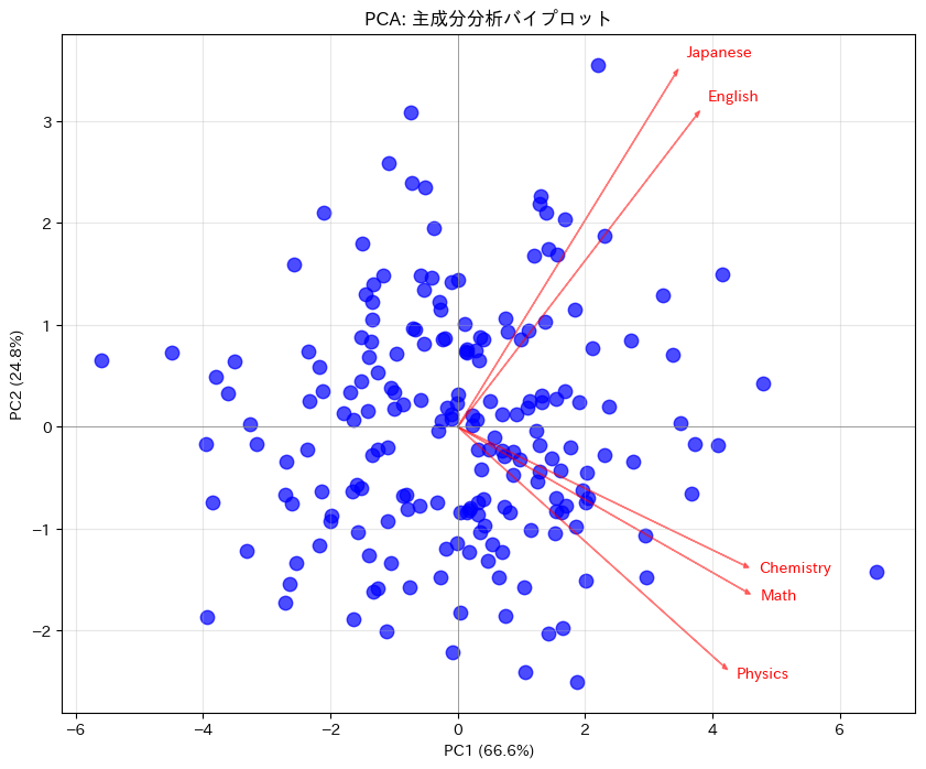 print(f" PC1 vs 言語能力: {np.corrcoef(pca_scores[:, 0], F_言語能力)[0,1]:.3f}")