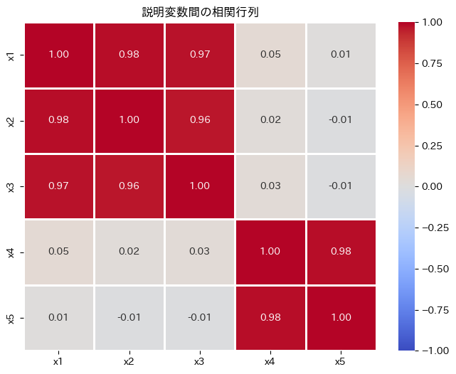 このヒートマップを見ると、x1-x2-x3のグループとx4-x5のグループ内で非常に高い相関(0.9以上)があることがわかります。