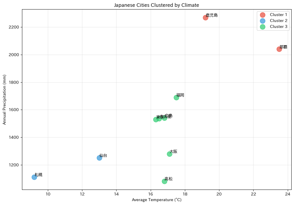 散布図を見ると、同じ色(同じクラスタ)の都市が近くに集まっていることがわかります。