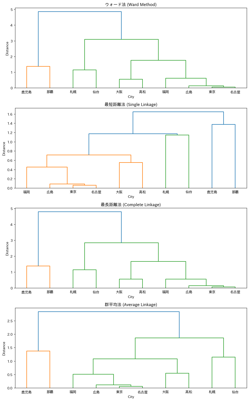 階層的クラスタリングでは、「どのクラスタ同士を結合するか」を決める結合方法(linkage)が結果に大きく影響します。