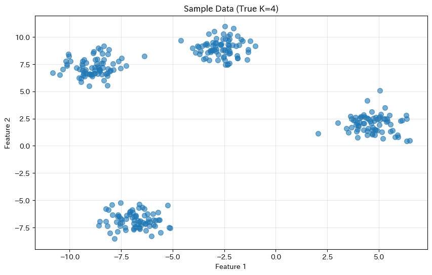 このデータには「本当は4つのクラスタがある」ことを覚えておいてください。