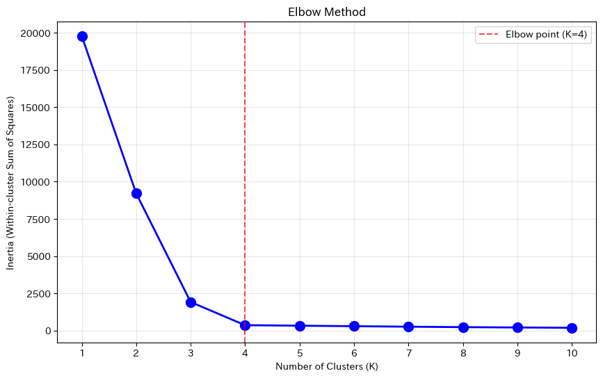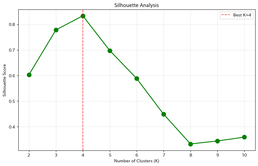 たとえば、シルエットスコアはK=4が最大だったとしても、ビジネス的にはK=3の方が施策を打ちやすいかもしれません。逆に、K=5にした方が各セグメントの特徴が明確になることもあります。