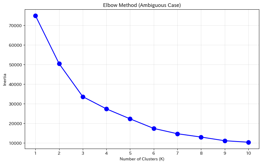 inertiaはKを増やすほど減少しますが、適切なクラスタ数を超えると減少幅が小さくなります