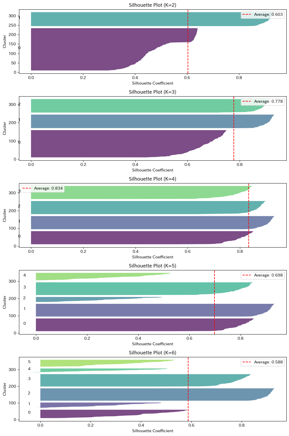 K=4のプロットが最もバランスが良く、全てのクラスタが平均線を超えていることが確認できるはずです。