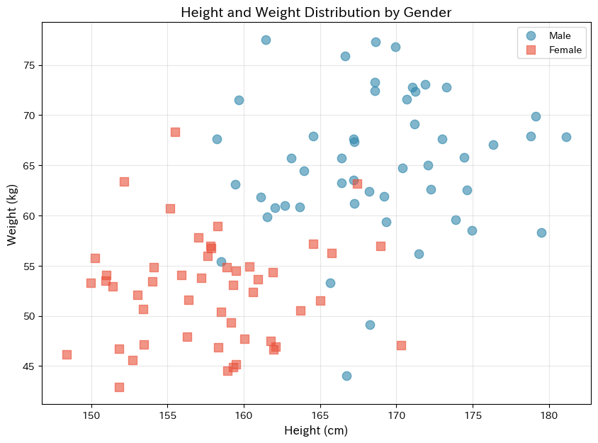 print(f"データ数: {len(body_df)}人(男性{n_each}人、女性{n_each}人)")
