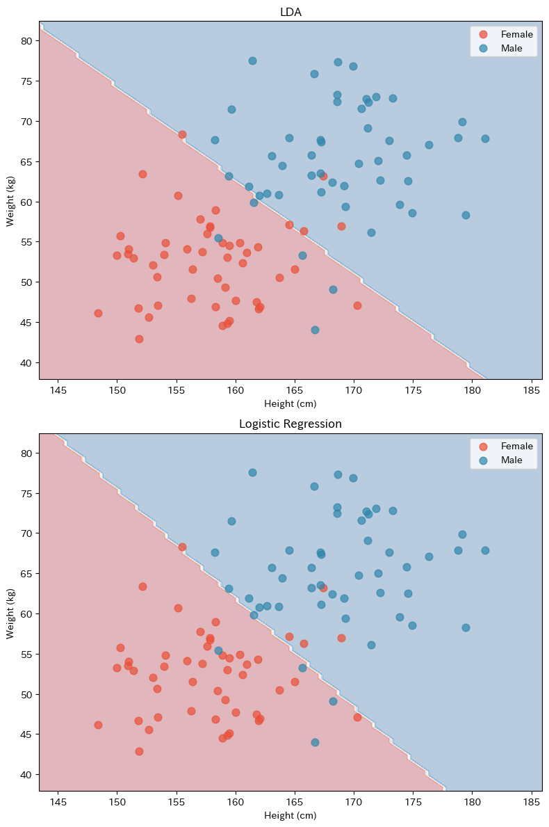 LDAとロジスティック回帰は、どちらも線形の境界を引きますが、アプローチが異なります。LDAは分布を推定(生成的モデル)、ロジスティック回帰は確率を直接推定(識別的モデル)です。