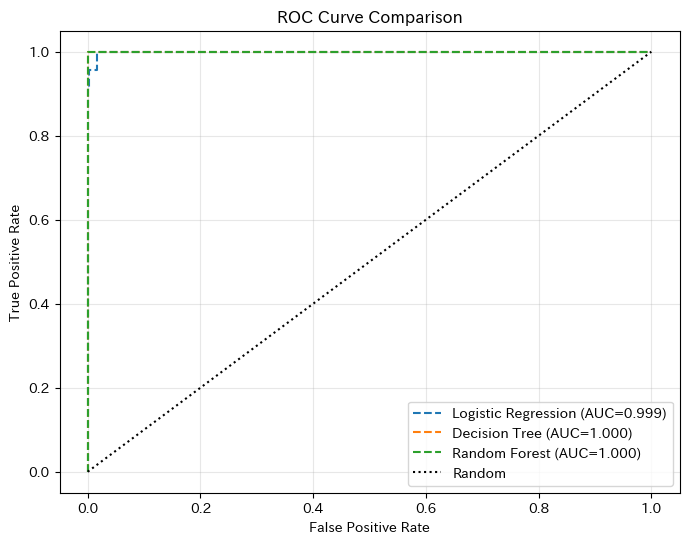複数モデルのROC曲線を同じグラフに描いて比較してみましょう。