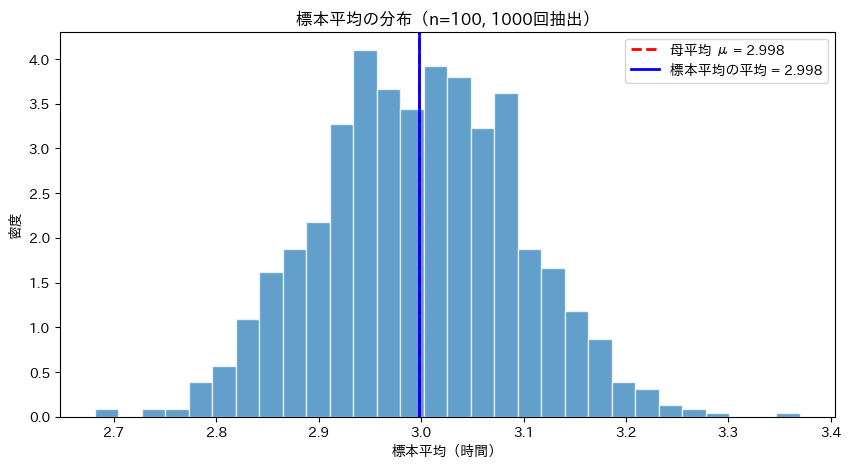 print(f" 標本平均の平均: {np.mean(sample_means):.3f}時間")