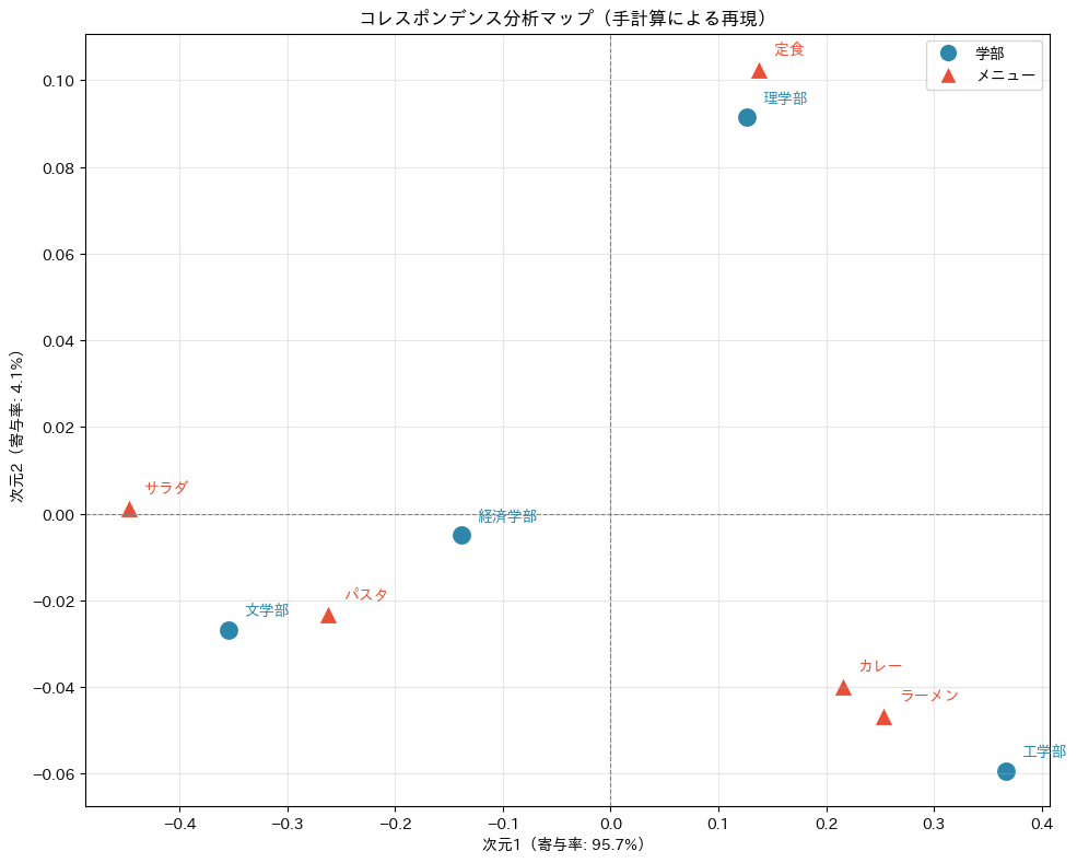 ax.set_title('コレスポンデンス分析マップ(手計算による再現)', fontsize=14)