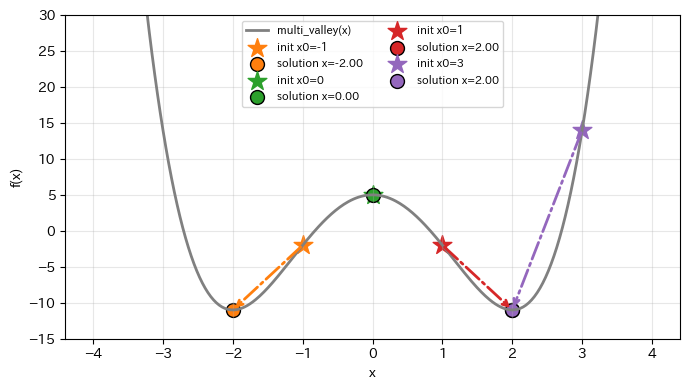 • x0=0:探索の出発点(初期値)です。最適化は、この値から出発して「もっと小さくなる方向」を探していきます