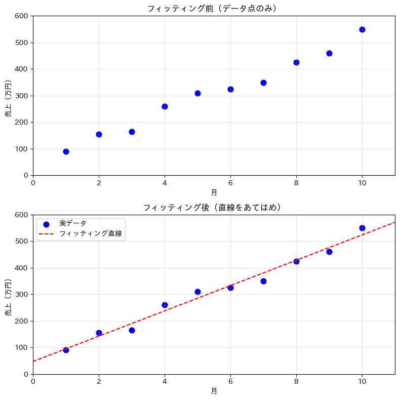 np.exp(b * x):ネイピア数 e(約2.718)のb * x乗を計算します。指数関数の増加を表現するときに使いますp0=[50, 0.5]:パラメータの初期値を指定しています。指数関数のように急激に増加する関数では、初期値を指定しないとうまくフィッティングできないことがありますplt.axvline(x=8.5, ...):実データ部分と予測部分の境界に縦の点線を引いています