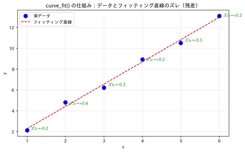 curve_fit() は、この緑の線(ズレ)の合計が最小になるパラメータを見つけてくれます。
