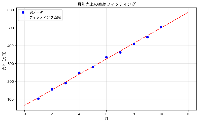 ある店舗の月ごとの売上データに、直線をあてはめてみましょう。