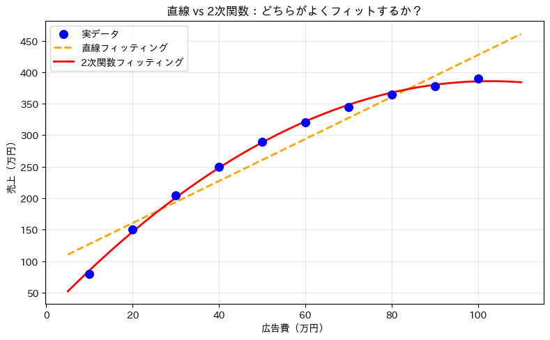 popt(最適パラメータ) とpcov(共分散行列) の2つが返される- 直線・2次関数・指数関数など、データの傾向に合った関数を選ぶことが重要